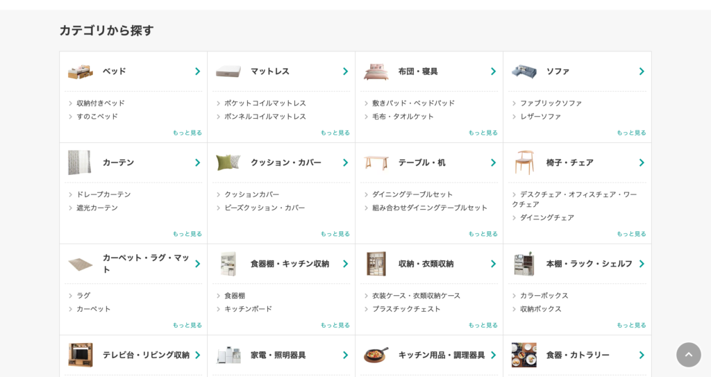 カテゴリから探すことができるのはECサイトでは当たり前のように思えますが、ニトリのサイトはデザインがシンプルで見やすくきれいです。アクセントカラーの青緑も矢印やもっと見るなど、目を引く場所に使われています。