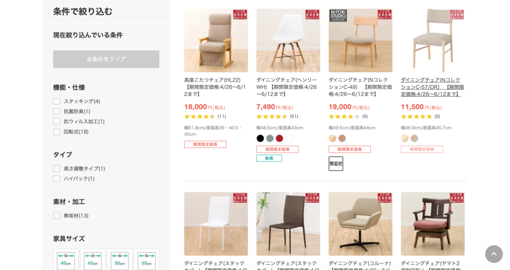 実際に私が使っていて役に立った機能です。家具の幅や色、値段を決めて絞り込み検索ができ、とても便利です。