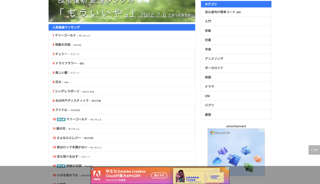 ただ、簡単にコード進行わかる・色んな曲あるとか手軽に弾ける等考えると最高のサイトです。