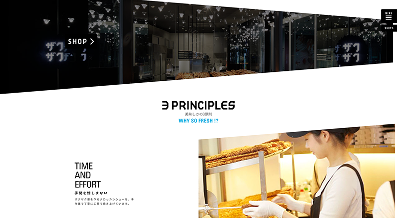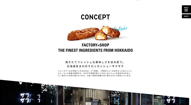 「クロッカンシューザクザク」のサイトはフォントやデザインなどで全体的に統一感を出しつつ、お店や商品の雰囲気がしっかり表れていて、見ていて楽しく、とても見やすいサイトになっています。