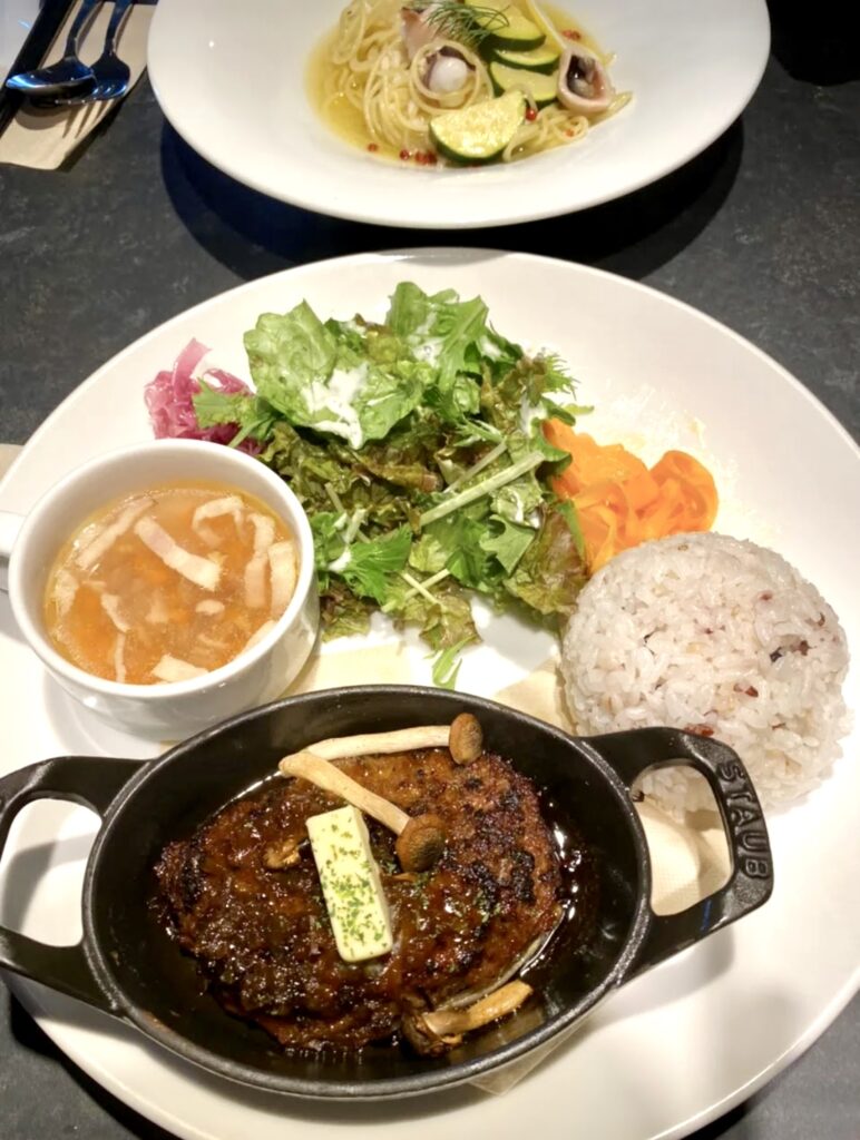 メイン、サラダ、スープがワンプレートになっていて、ワンプレートで楽しめます。