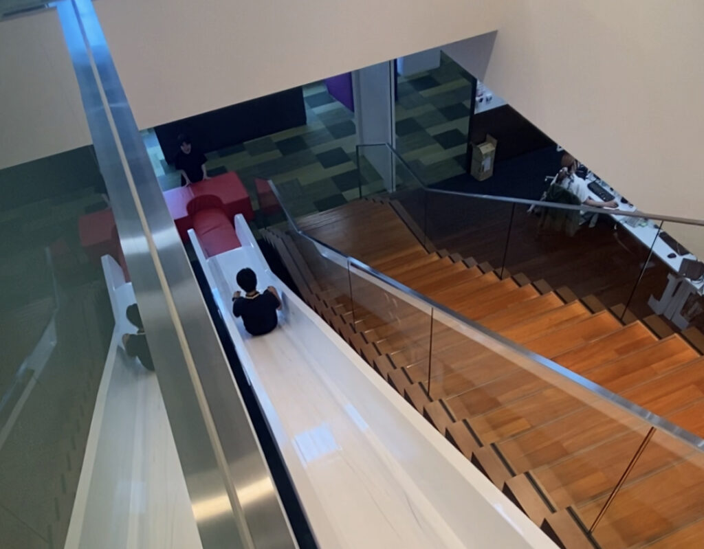 授業を受けていて思うのですが、ずっと椅子に座ってパソコンを触っているのはどんだけ作業が好きでもしんどいもの。そんな時気分転換に滑りたいやジャングルジムでミーティングしながら行えば新しいアイデアなどが閃くのかもしれません。
