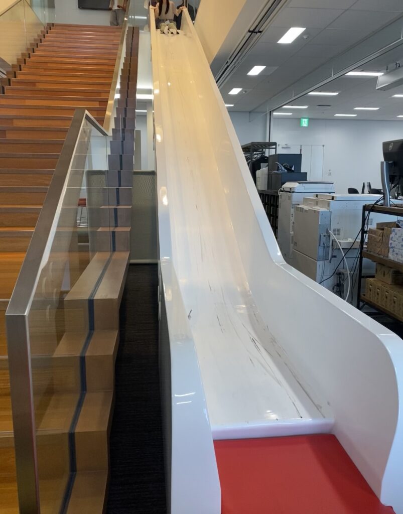 社内にはそれぞれのデスクが置かれたワークスペースだけでなく遊び心あふれるジャングルジムやブランコのような椅子が用意されているスペースもあって、発想やアイデアを大切にしているエイチームならではの遊び心ある空間だなと思いました。