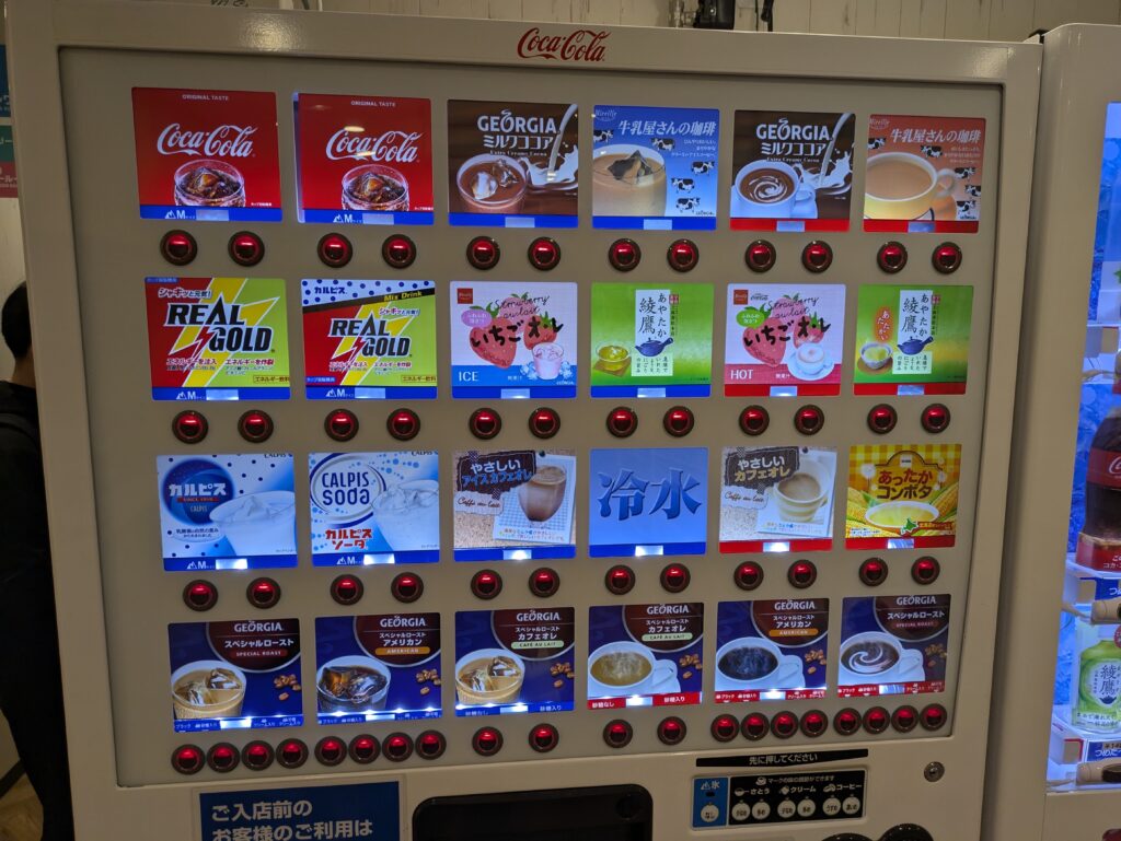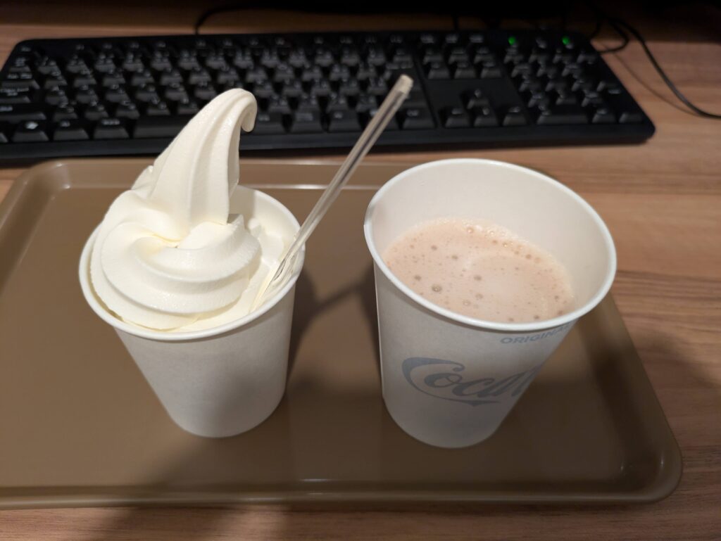 よくあるドリンクバーではなくこのような自販機タイプのドリンクが飲み放題です。僕はホットのミルクココアが好きです。