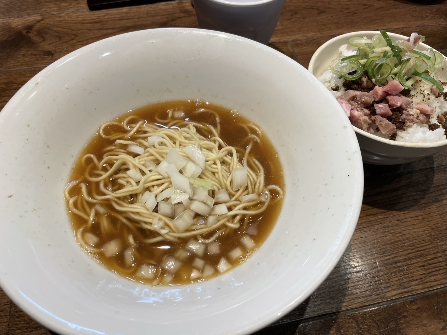 朝ラーメンは、半ラーメンとおかか飯(刻みチャーシュー付き)がセットになっており、